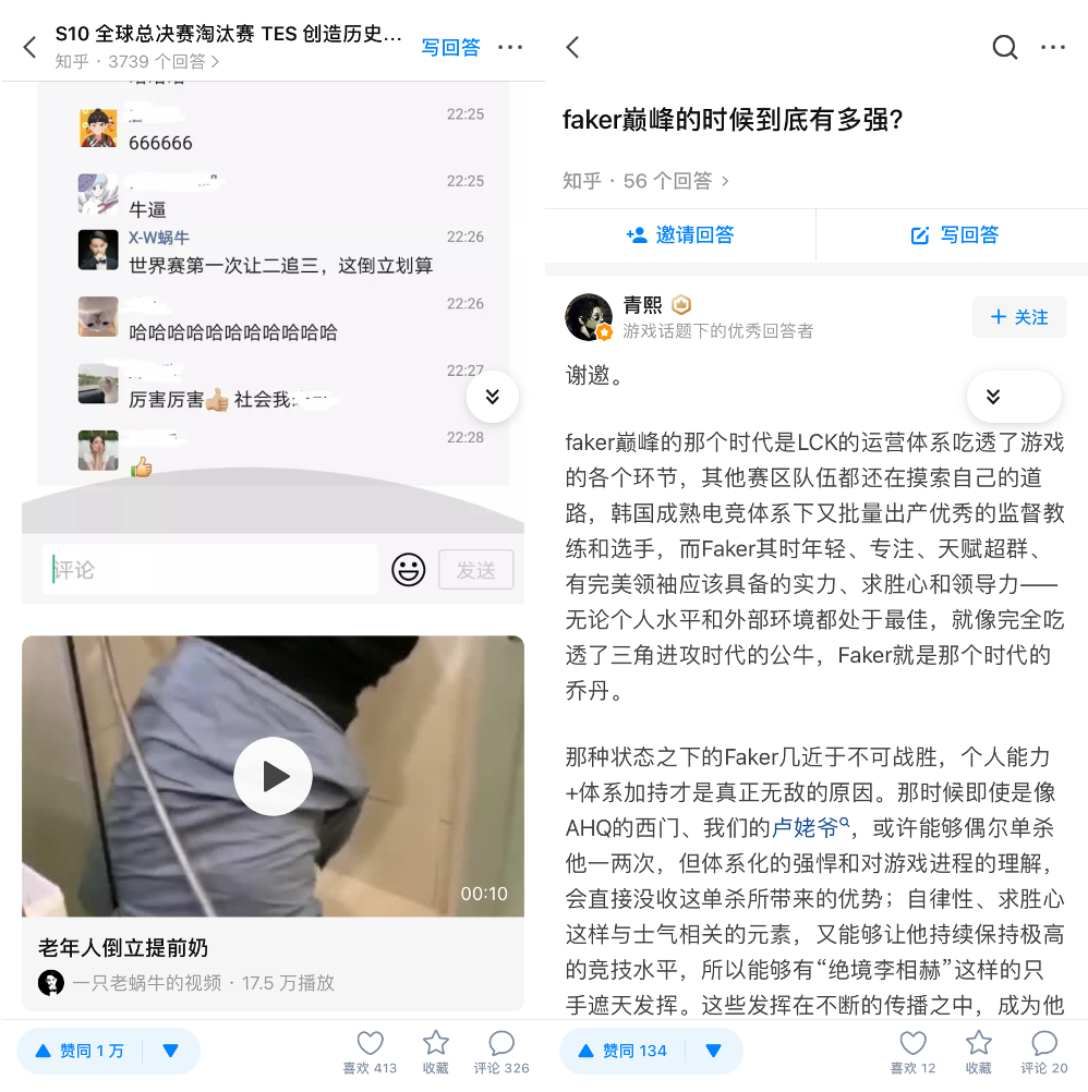 “S10全球总决赛淘汰赛TES创造历史让二追三击败FNC晋级四强,如何评价这场比赛?”“S10全球总决赛四强战TES vs SN,你觉得谁能晋级决赛?”在知乎,聚集大量电竞粉丝讨论赛事热点。同时,在“电竞狂欢聚焦S10全球总决赛”专题下,“知乎云现场”“大咖观点”“视频活动”等六大板块为粉丝多角度剖析这场电竞盛宴。