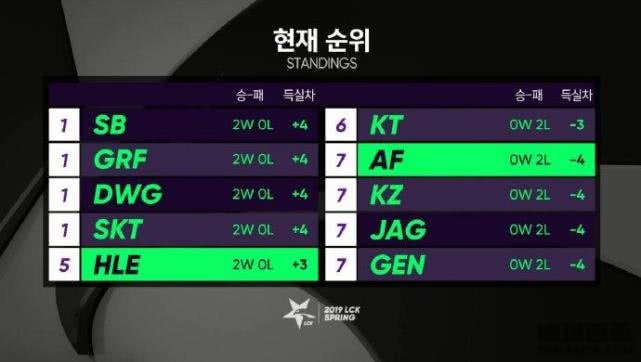 与之形成鲜明对比的是,在排行前列的队伍中有三幅新面孔。GRF加入LCK不满一年,SB、DWG也是2019年新加入LCK的队伍。但是初登LCK舞台,便展现出了极强的竞争力。
