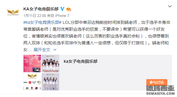 随后KA女子电子竞技俱乐部官方微博发文解释,原文如下:
