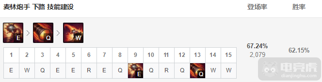 小炮E技能具备强力的爆发伤害,Q技能能够为小炮提供极高的攻速加成,W技能提升了小炮的灵活度,大招可以打出伤害并击退敌方英雄,提升自身的保护能力。