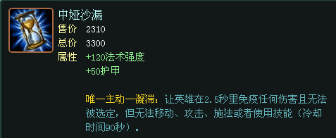 一件有着护甲加成,一件有着魔抗加成,这两件装备都是偏向于防御性的出装,面对敌人混合输出的阵容也是增加了自己的生存能力,尤其是中娅沙漏的2.5秒无敌时间,也是给了自己缓冲反击的时间。