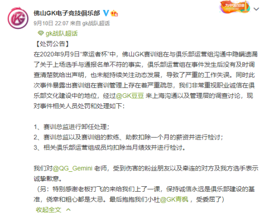 本次事件的确对GK的声誉造成了不小的影响,但本以为就会不了了之,可昨晚GK再次突然发布声明对于九号的事情进行了进一步的说明,GK老板豆豆直接飞到上海基地 给员工上了一课,并且做出处罚,赛训总监卸任,教练组扣除一月工资,俱乐部运营组成员当月绩效扣除等处罚,并且@青枫让他受委屈了,字里行间可以看出GK的确在九号的出战选手中存在问题,这个处理结果还是比较严厉的,不过如果是当天能够这样的话 ,可能GK就不会被喷这么多了。