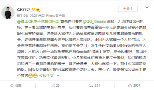 最后GK老板豆豆也在微博上向Gemini进行了道歉,并且检讨了自己和俱乐部的问题,这件事就算到此结束了,这次GK的补救措施还算成功,态度也非常的诚恳,不过第一天当晚的声明真的就有点搬起石头砸自己的脚了,职业俱乐部为自己说的话做的事负责,才能给年轻的粉丝,观众们做好榜样,让KPL的神生态越来越好!