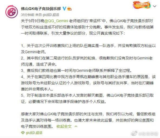 比赛结束后,GK官方微博第一时间发出声明,本次幸运杯上场的的确是一队选手,只是在第二局中将梦岚轮换,没有和Gemini沟通,非常抱歉,并称青枫巅峰赛的账号是他的朋友再玩,并不是本人。这个声明犹如火上浇油,让骂声更大了,根本无法令人信服。