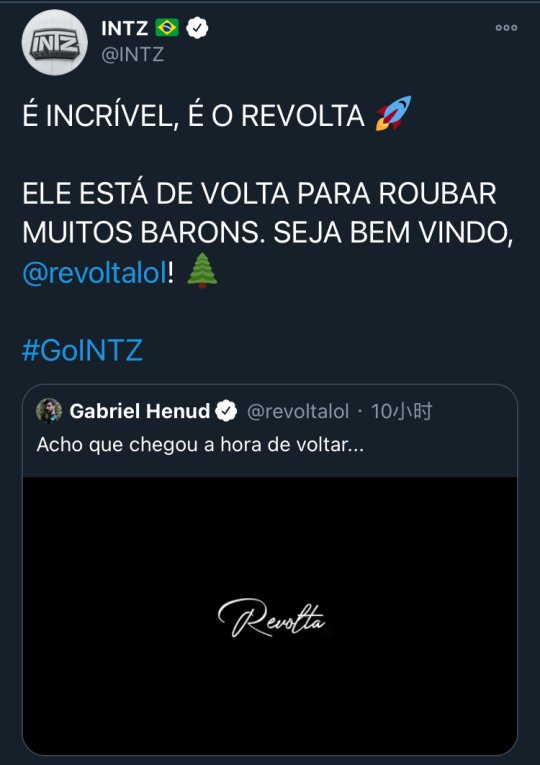 近日,代表巴西CBLOL赛区出战S10全球总决赛的INTZ战队在他们的官方推特上逐步宣布了新赛季的阵容。值得注意的是,厂长的粉丝,曾在S6上使用盲僧率队战胜EDG的打野选手Revolta此番重回老东家效力: