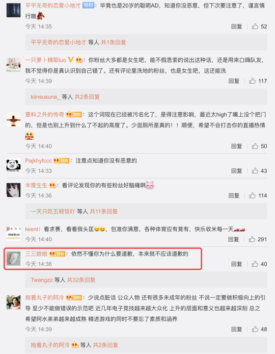 还有网友表示“依然不懂你为什么要道歉,本来就不应该道歉的,没说母人,没有对着女性说过母,就是口嗨队友而已,之前也说过基地里都是公的,但是说话不讲究是真的,下次注意就好了。”