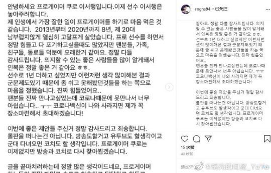虽然我还想以选手的身份再打一年,但经过深思熟虑后得出了结论。因为我还要履行兵役,所以决定休息一下,去做一些之前没能做的事情。过去真的非常辛苦。