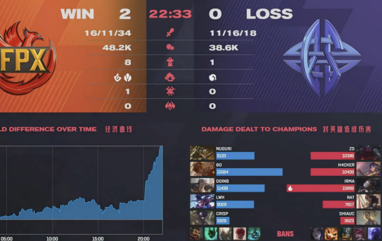 回顾本次的比赛FPX的表现可以说是相当的不错,上来第一局FPX就凭借着优秀的个人能力,成功在前期的团战中打出优势,中期双方频繁爆发团战,依靠Nuguri杰斯的不断Poke逐渐将优势扩大,在25分钟时FPX经济优势已经超过1万,最终因为经济劣势过大FPX在31分钟打赢团战一波结束比赛。