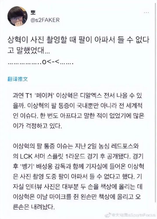 此前T1就发公告,Faker因为手伤暂停七月的直播。也有海外博主爆料,Faker选手在上周与NS赛后拍摄过程中就说过自己手臂太痛。