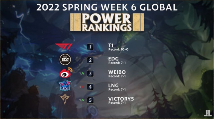 然后是最受关注的前五名,T1雄踞榜首,EDG紧随其后,WBG、LNG和V5分列3-5名。现在的LCK完全就是T1一家独大,11连胜未尝一败,把其他所有队伍各击败一次的同时还双杀了DK,在LCK难觅对手。LPL这边WBG和V5都是最近状态火热的战队,THESHY的Rookie在离开了iG的舒适圈后重新来到了职业生涯又一个春天。