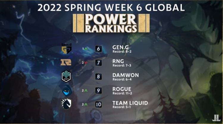 6-10名的LPL队伍只有RNG,最近被V5零封是RNG排名下滑的重要原因。另外一边LCK赛区的GEN和DK都落在这个区间,考虑到DK本赛季已经被T1双杀了,他的排名应该还会继续掉。
