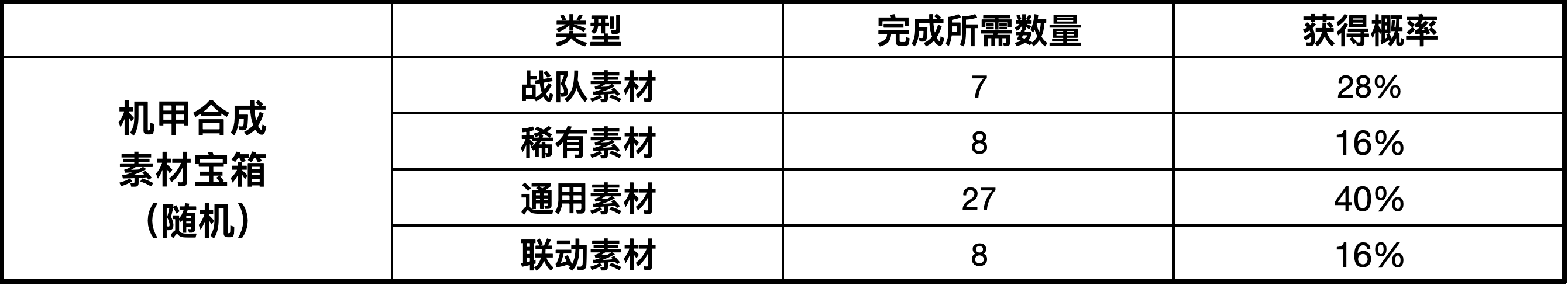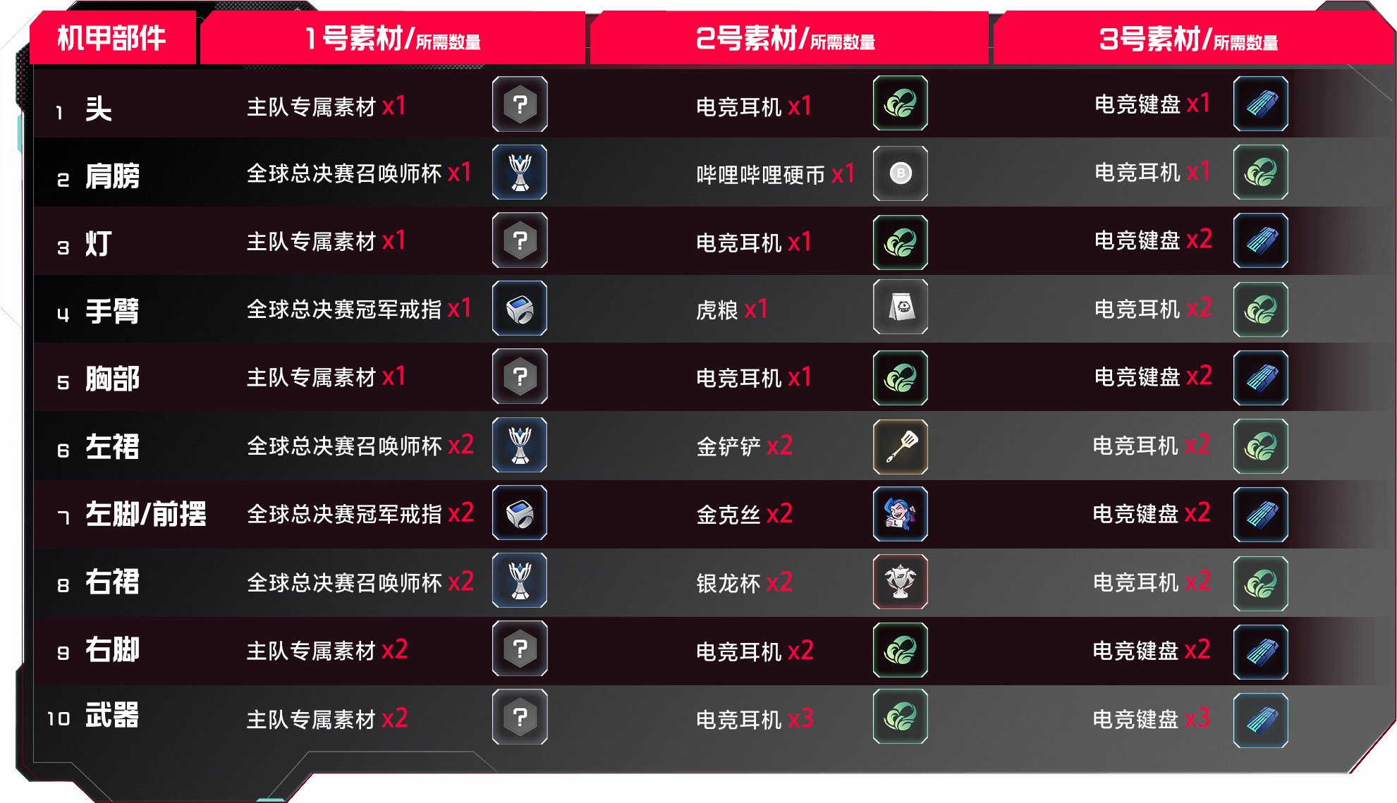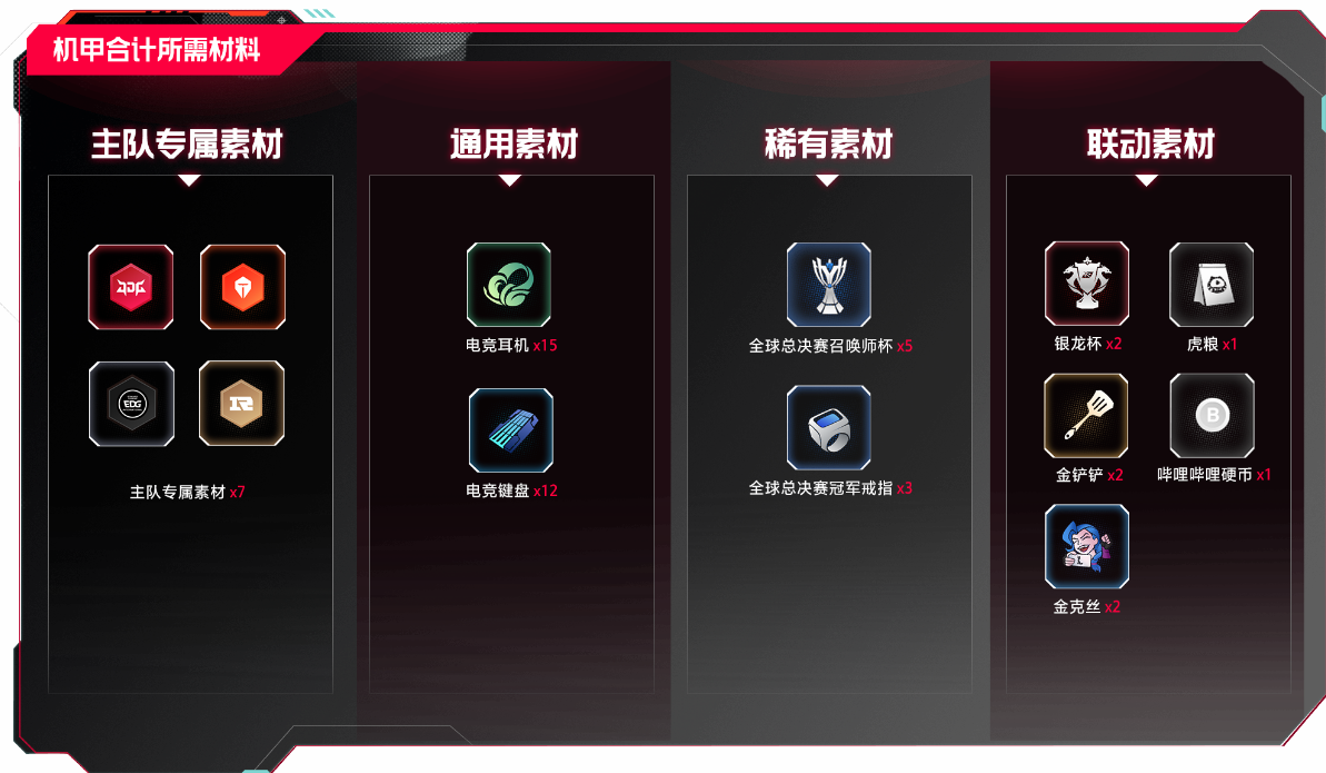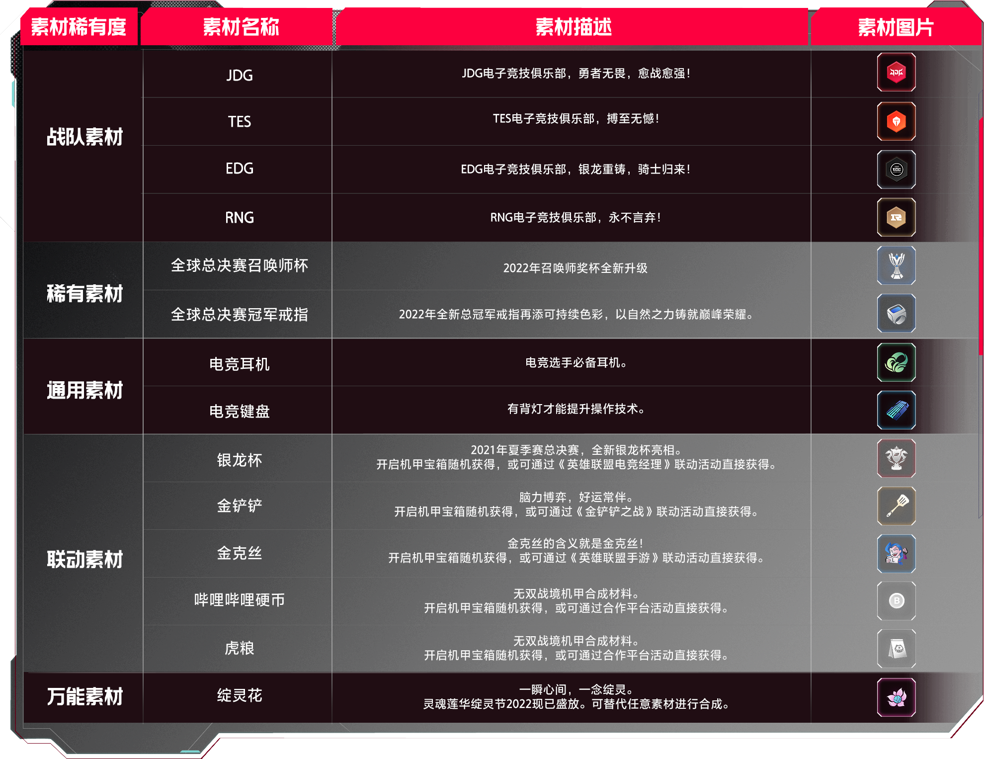 ** 关于机甲素材:机甲素材可从通过任务获得的“机甲合成素材宝箱”内随机获得(宝箱内含素材种类请以页面描述为准),其中联动素材还可通过英雄联盟手游、金铲铲之战、英雄联盟电竞经理及合作平台的联动活动内直接获得。