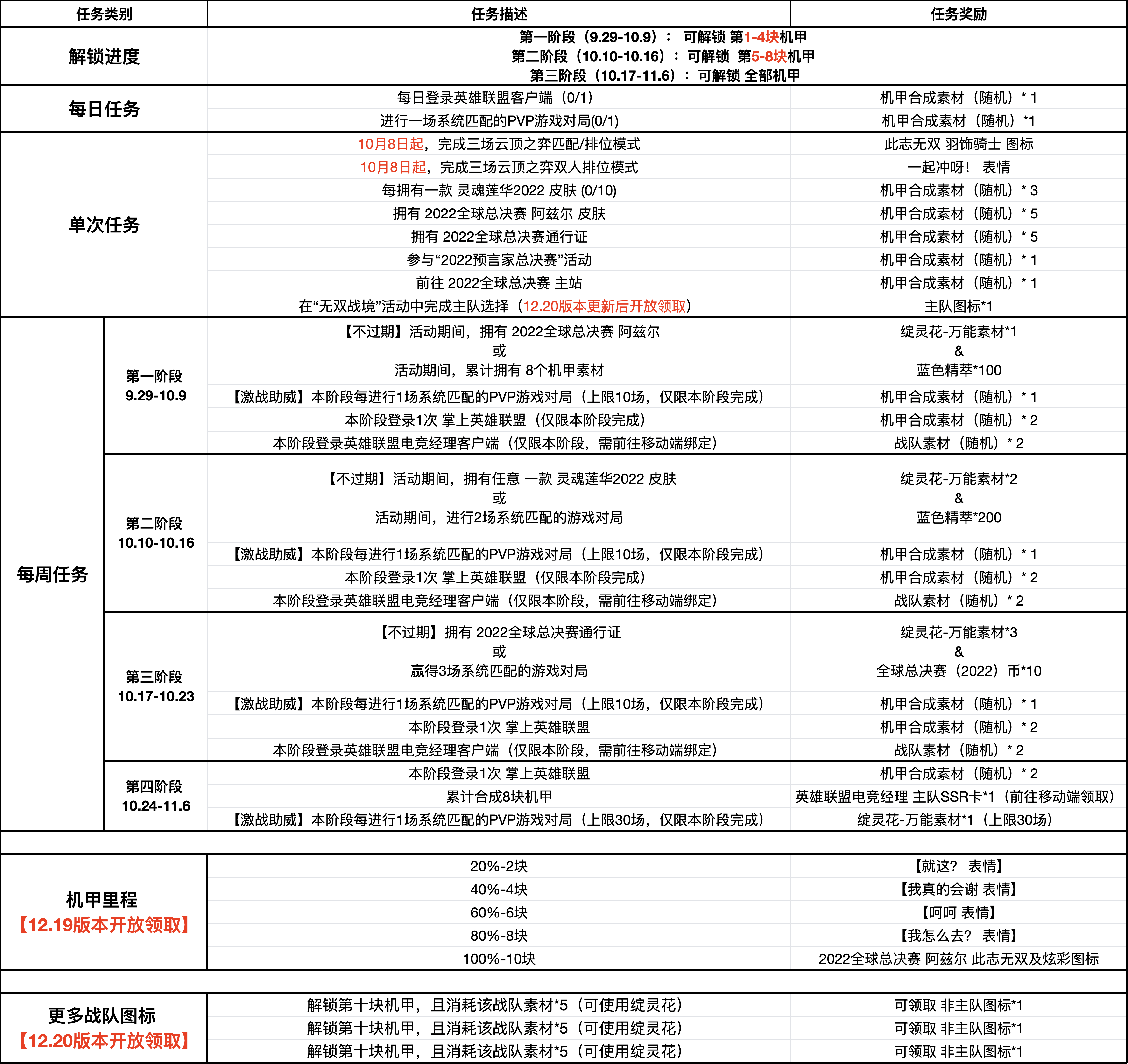 3.完成一系列任务,可获得“机甲合成素材(随机)宝箱”、炫彩皮肤、图标、表情、全球总决赛通行证(2022)币、蓝色精萃等丰富奖励。除此之外,分阶段还将开放“激战助威”任务,帮助召唤师在峡谷征战的同时快速获取更多合成素材。