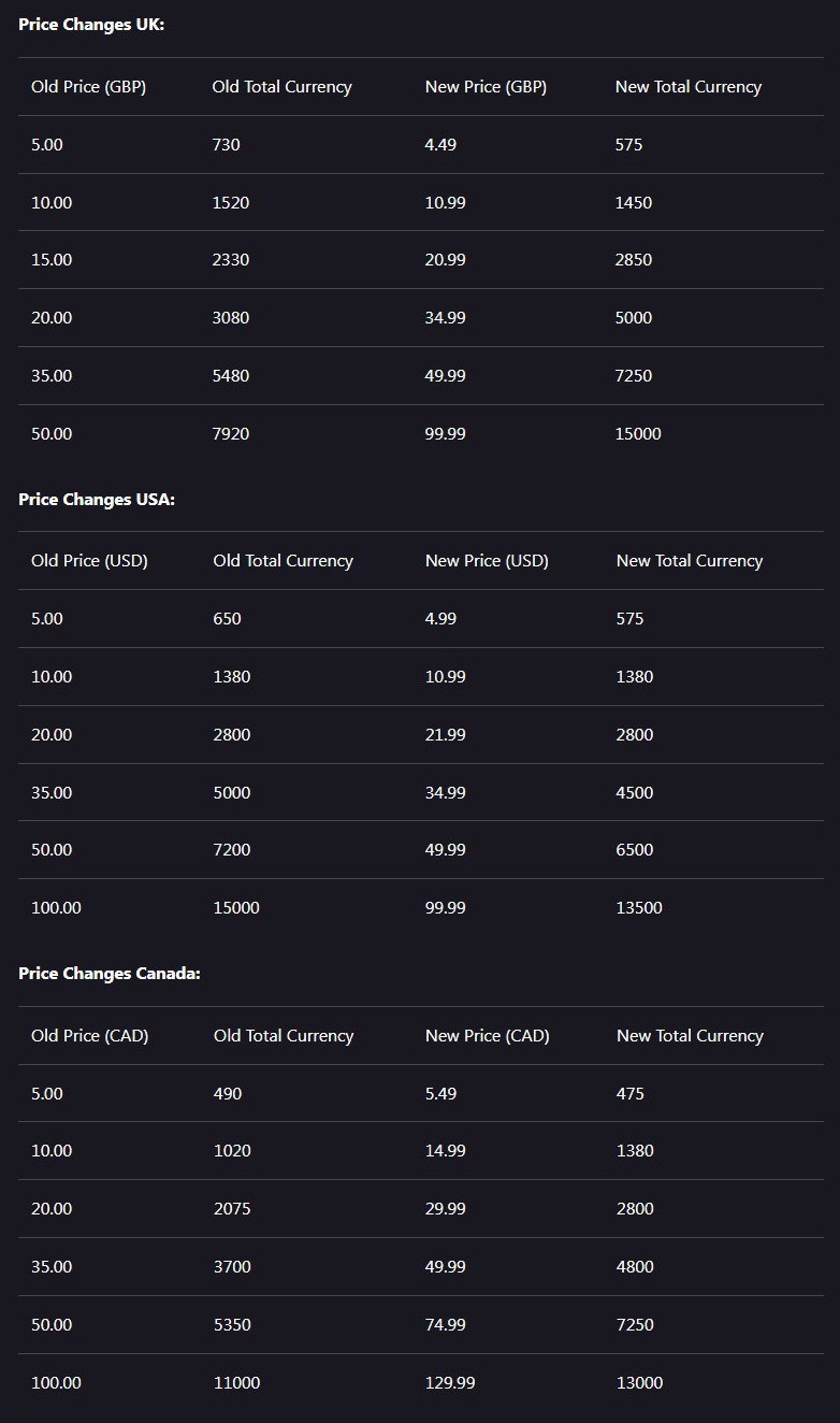 从表中可以看到,以前美服5美元可兑换650点券,调整后4.99美元可兑换575点券,平均涨幅在9.8%左右。再看看其他区服的涨幅,涨幅最高是匈牙利地区,涨幅为23.3%。波兰20%,土耳其19.7%,智利16.3%,罗马尼亚16.0%,新西兰15.9%,拉丁美洲15.7%,日本13.8%,澳大利亚13.3%,捷克11.7%,秘鲁10.2%,墨西哥9.4%,乌拉圭8.9%,巴西8.6%等等。
