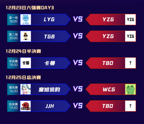 TGB首战告捷,以碾压的战绩开门红鼓舞士气;但在12月23日,依旧有一场对决等着他们,能否保持势头,杀入决赛,现在还未知。六强赛的队伍,除YZG外均已进行过比赛。卡曼队一胜一负的战绩,能否晋级仍在观望中。23日的直播中充满了惊喜与未知,哪些队伍能突出重围,哪些队伍将抱憾离场,六强赛最后一日对决不容错过。