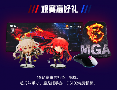赛段升级,好礼加倍,直播间内抽奖礼品也越来越丰富给力~官方手办、DS102鼠标现已就位,来虎牙直播平台MGA官方直播间(房间号:22528167),期待遇见欧气爆棚的你!