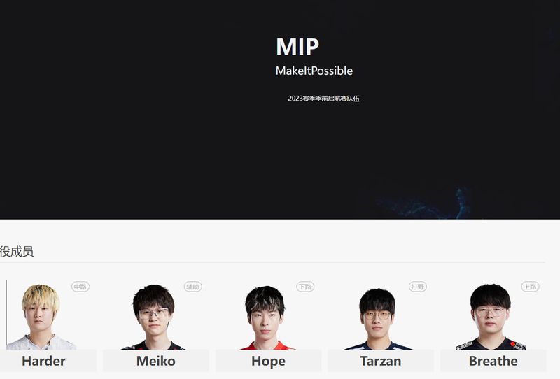 MIP(MakeItPossible):上单Breathe、打野Tarzan、中单Harder、下路Hope、辅助Meiko