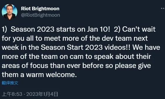 拳头执行制作人Brightmoon在个人推特透露,2023赛季将于1月10日开始,此外Brightmoon还表示下周设计团队将发布2023赛季的相关视频,今年团队成员更多,谈论的内容也将超过以往任何一年。