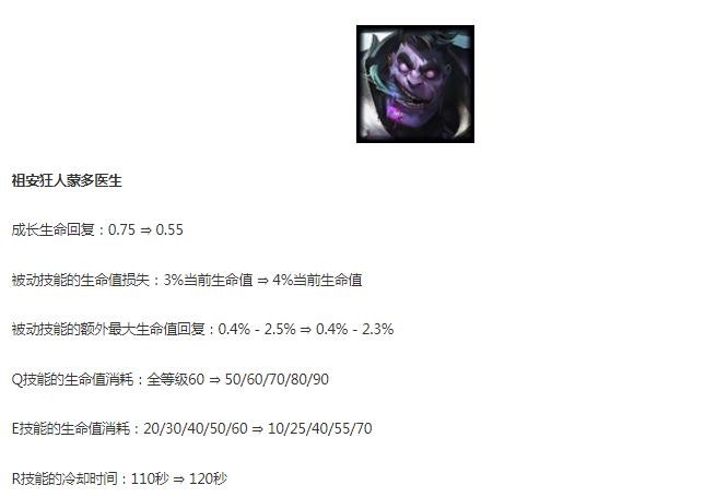 就在最近12月15日英雄联盟进行了一波小调整,对不少英雄进行了削弱,不知道有没有小伙伴喜欢玩的英雄,那么下面就给大家带来LOL12.23蒙多削弱一览。