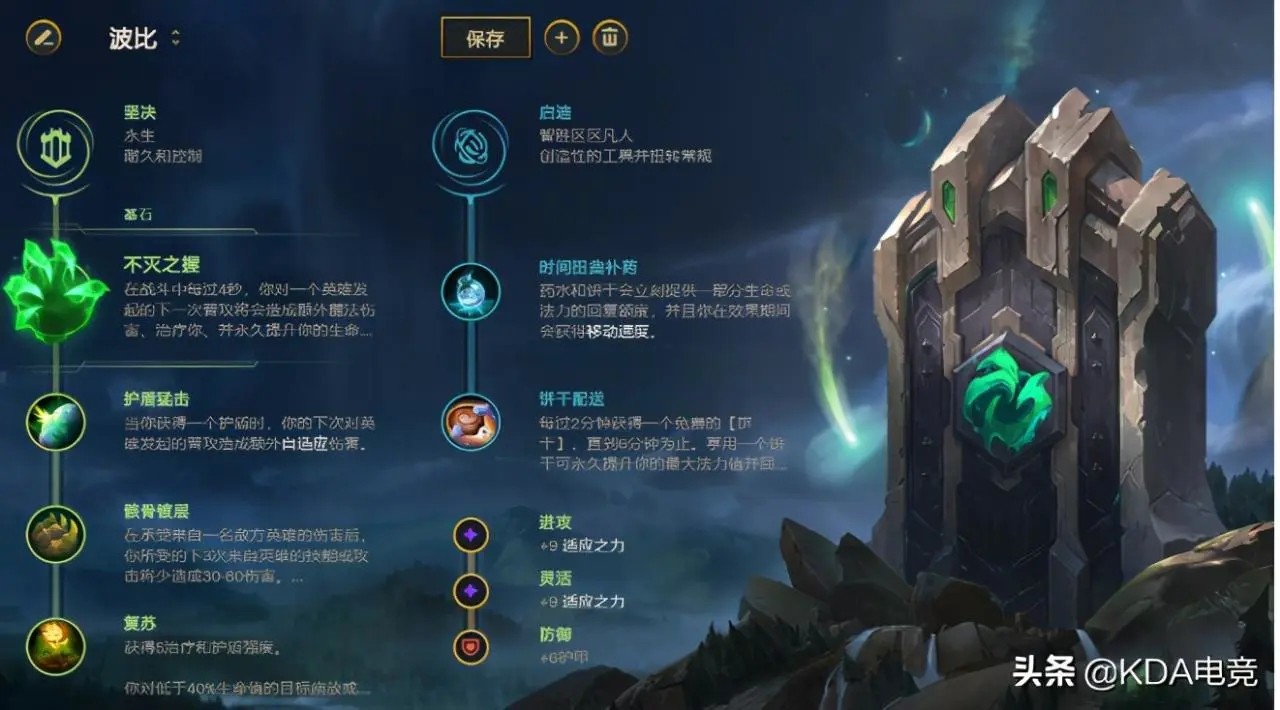 符文选择不灭之握和骸骨镀层增强波比的对拼能力,副系符文增强波比的续航能力,护盾猛击搭配波比的被动护盾能获得不错的收益加成。