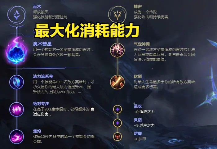基石符文推荐选择彗星,彗星寒冰在符文系统刚改版以来就有,寒冰W距离远范围广容易命中,自带的减速也能让后续的彗星更容易命中。后续的小符文推荐最大化对线期的消耗能力,点出法力流系带、绝对专注与焦灼。副系选择精密系的气定神闲与砍倒。这样点符文的好处在于,能够最大化彗星寒冰在前期的消耗能力,绝对专注与焦灼提升寒冰W的伤害,砍倒则是配合长剑三红出门,让寒冰在面对多兰装备出门的ADC时,能够获得砍倒的伤害加成,最大化前期消耗能力。法力流系带与气定神闲能够提供十分可观的蓝量续航,让寒冰在不出女神泪的情况下也能在下路不断W消耗对手。