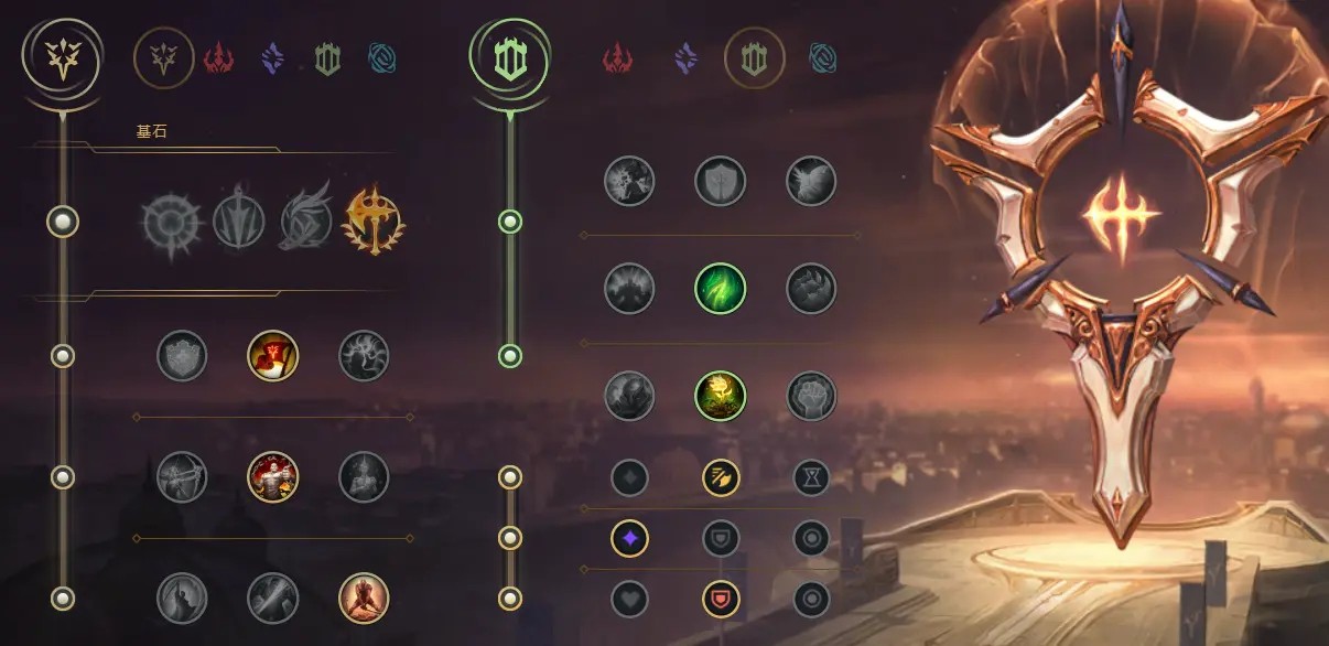 血魔流主在选择持续输出打法所以我们主系选择征服者,增加自身对拼能力的同时增加吸血能让我们有时间放出更多的W,下面点出凯旋、韧性和坚毅不倒。副系选择坚决,点出骸骨镀层或复苏之风视对线英雄选择点出,复苏血魔铁男流必点。