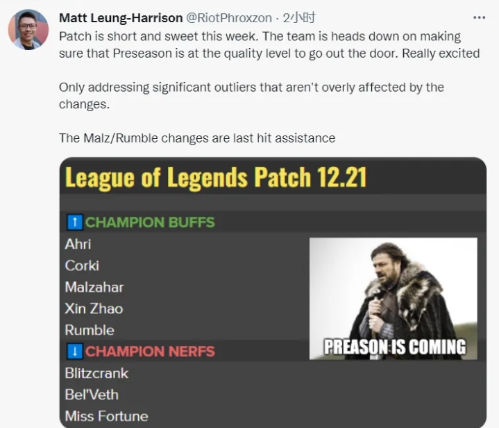 随着赛季的持续进行,新的版本也将随之到来。今日召唤师峡谷团队的首席设计师Riot Phroxzon公布了12.21版本改动前瞻。以下为推特内容大意: