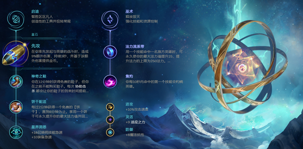 在符文的选择上,中单沙皇Yagao选择的是启迪+巫术,适应之力+1,攻速+1,魔抗+1首先主系选择巫术,然后点先攻,小符文选择神奇之靴+饼干+星界洞悉,先攻搭配小符文神奇之靴加速沙皇的发育速度,使其快速过度前期的弱势期,搭配副系法力流系带+焦灼提高沙皇前期的作战能力。