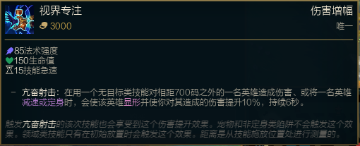 由于泽拉斯的技能都很远,所以很好的触发视界专注的效果。我们在触发视界专注的时候打出去的伤害会增加很高,顺一点可以直接R秒杀满血的后排英雄,提升伤害。