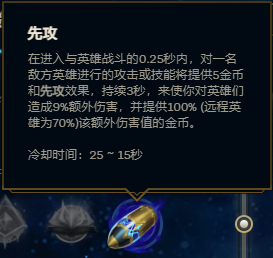 【额外9%伤害、70%伤害值金币、冷却时间25~15秒】