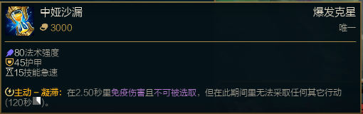 中娅沙漏,泽拉斯最好的保命装备,但是通常都不出,除非对方刺客很多,否则就算有沙漏,等到对方碰到你的时候基本上金身也保护不了你了。