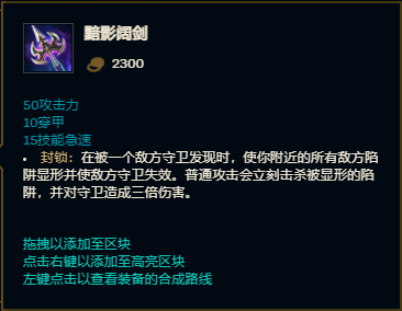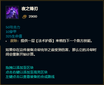在不需要进行针对出装时我们就可以保证自己的开团稳定程度,夜之锋刃就是不错的选择,有一个法术护盾可以让我们拥有更高的容错率。