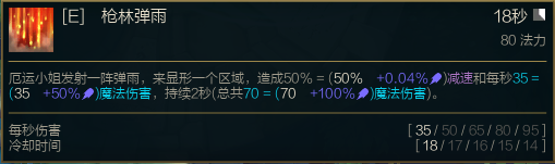 E技能是辅助女枪的主要对线换血技能,拥有很高额的减速效果,同时减速效果会根据法强的提升而提升,中期有不错的限制能力。