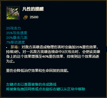 紧接着提供移动速度和20%的暴击几率,这些属性也是女枪十分需要的,R技能可以暴击,20%的暴击几率收益不容小觑。还有移速和攻速让女枪有了更多的操作空间,装备价格也十分划算,只要2500!