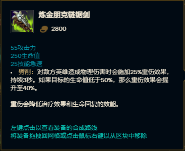 先说炼金朋克链锯剑,55攻击力、250生命值,25技能急速,比鬼书贵了300,但是多出了25技能急速,并且攻击力的收益在游戏中后期也是远远大于法强的。