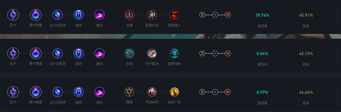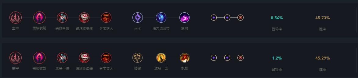 紧接着就是第二个符文黑暗收割,这是完全不适合女枪,但是成了想尝试辅助女枪玩家的救命稻草。由于黑暗收割有飞行时间,所以我们没有办法在放R技能时多次参与击杀并且触发黑暗收割,对线期的压制力也会比彗星小很多,不推荐大家使用。