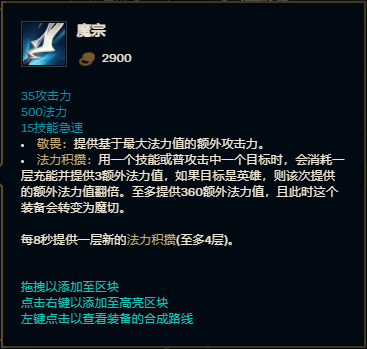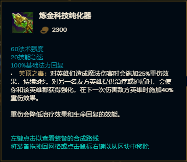 再说炼金科技纯化器,比鬼书少了30法强和300生命值,但是价格便宜的同时还有20技能急速。唯一的缺点就是重伤效果并不是特别理想,在缺经济的逆风局当中可以选择。