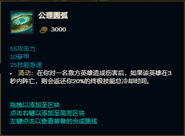 公里圆弧目前是返还20%总冷却时间,也就是20秒,大部分情况下当我们可以选择公里圆弧的时间段,击杀两三个英雄是没有办法让你的R技能快速使用。