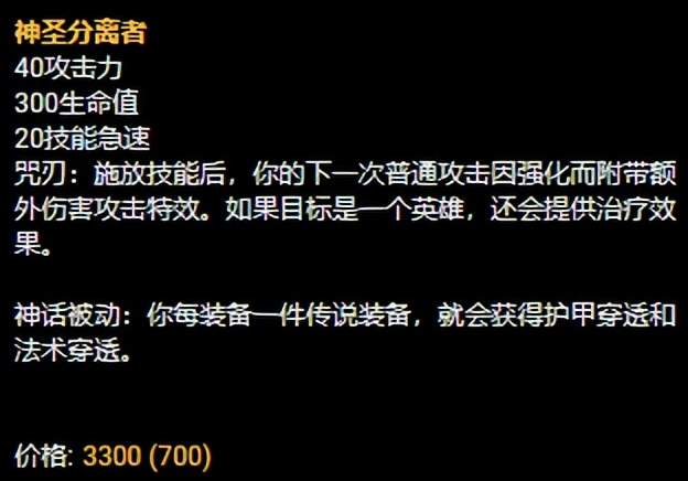 神圣分离者这件装备可以提供可观的技能急速、生命值等数据。上单豹女在对线、对拼的输出模式更多的是依赖平砍去打输出的,而神圣分离者这件装备的“咒刃”效果可以提供额外的下次普攻技能强化,尤其是在豹女利用远距离的Q命中对手在对手身上施加标记以后切豹子形态近身打出咒刃效果可以瞬间将伤害拉满。虽然上单豹女在出装方面没有过多的强调输出类型的装备,但是在早期出神分以后的输出模式相对也会更多一些。而且神分这件装备的“神话被动”的效果还可以提供可观的双穿,对提升豹女的伤害也颇有裨益。