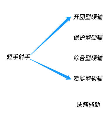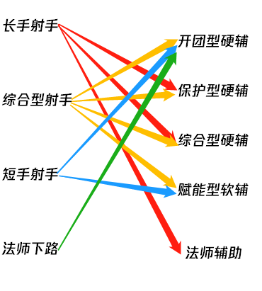 回顾一下,AD分为:长手射手、短手射手、综合型射手、法师AD。辅助分为:开团型硬辅、保护型硬辅、综合型辅助、赋能型软辅、法师辅助。