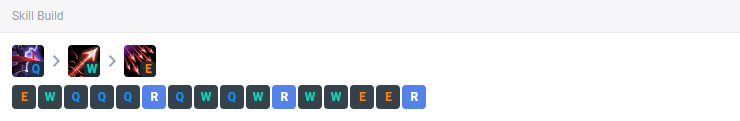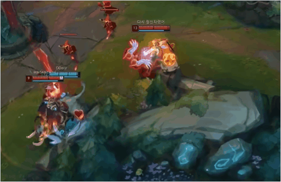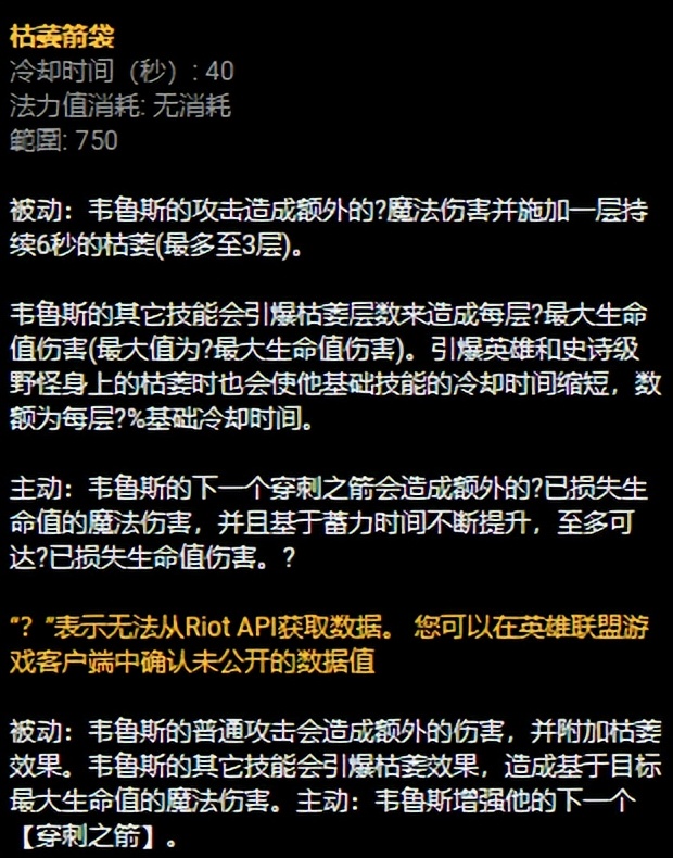 韦鲁斯的W技能在AP玩法里是非常主要的一个技能。这个技能的被动效果是可以让韦鲁斯的平A附带有额外的魔法伤害的(能施加枯萎效果)。W技能的主动效果是强化Q技能,这里有一个重点,W的主动开启以后Q(穿刺之箭)可以造成额外的已损失的生命值伤害!也就是在W的配合下Q具备很强的残血收割能力,这个技能的强化让韦鲁斯在后期的团战中可以相互配合,利用收尾的Q去收割对手的残血英雄。