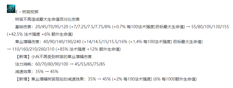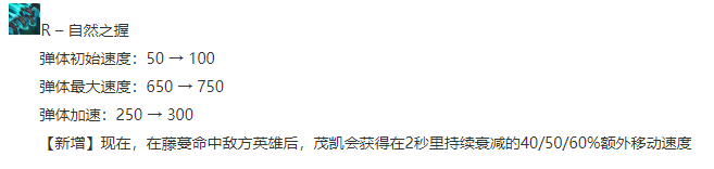 大招移速再次加强,并且命中敌人后会提高自身移速,强开团型技能,关于这个技能,和奥恩很像,生效慢控制强,更加建议在敌方后方释放,切断敌方撤退路线,正面释放移速较慢,很难跟上敌人逃跑速度,命中后的加速效果也给了大树逃生手段,贴脸短暂禁锢敌方自身加速跑路~