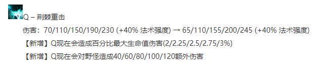 Q技能伤害小幅优化,不过3%的生命值伤害说实话有蝎子那味了,1000血就多30伤害。。。倒是对野怪伤害提升挺显著的,打野喵凯有待商议。(下版本还会加强Q对野怪伤害)