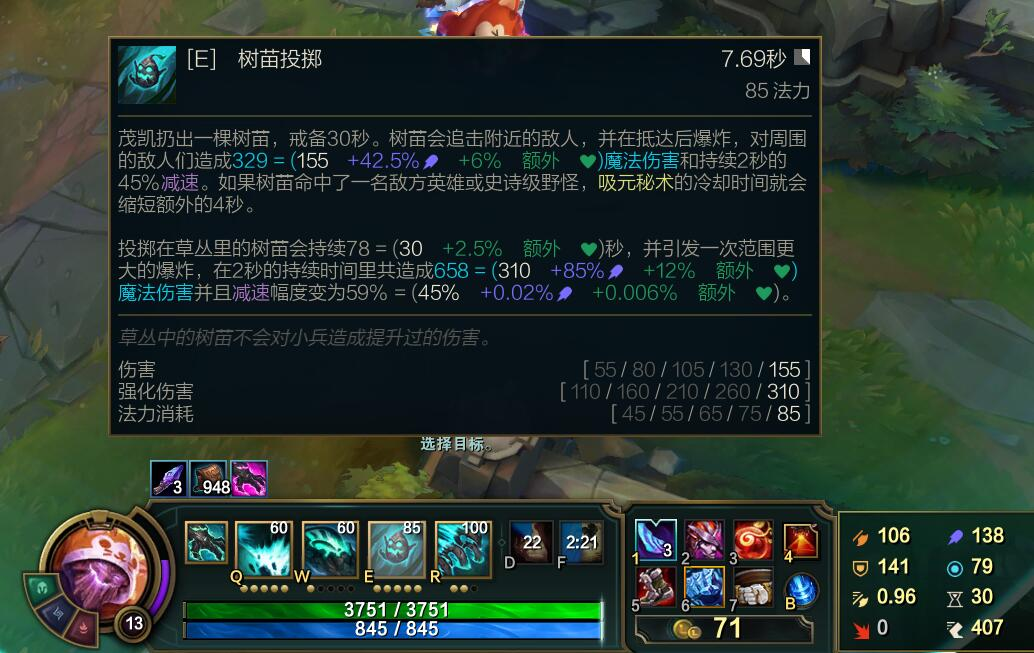 直接对比伤害即可,从240+16%最大生命值 修改到310+85%AP+12%自身额外生命值,先说结论,前期对野怪伤害降低了,之前3个喵子能快速帮打野,现在基本没啥伤害了。。。那么,在传统AP两件套的情况下伤害变化如下:(法杖修正工资装AP)