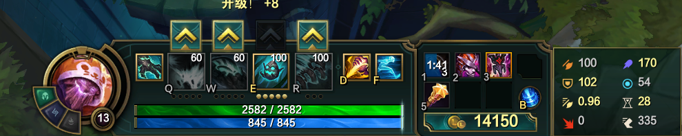 但是问题也很大,虽然这把我是副E打法,但实际情况满级E和1级E 伤害差距比较小(200)高级E蓝耗还非常高,所以加点方面建议主Q副W,提升团战能力。