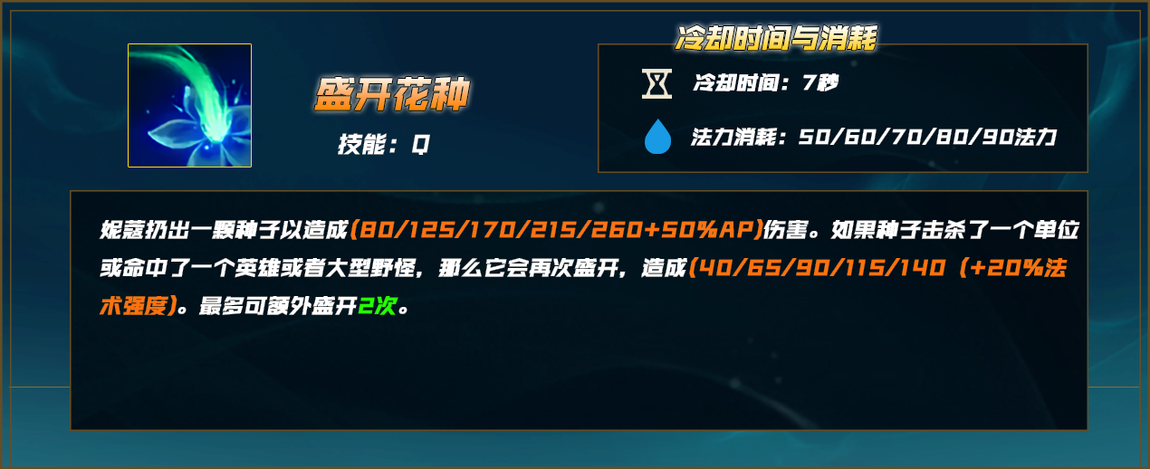 妮蔻扔出一颗种子以造成伤害,种子在再次命中英雄或者技能单位会盛开,最多炸3次。