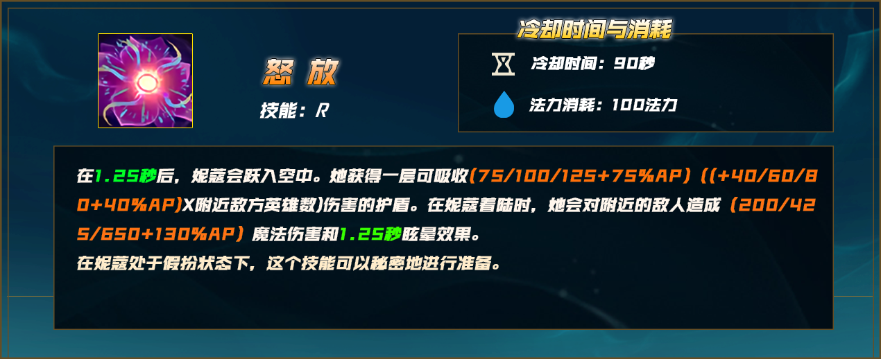 在准备阶段后,妮蔻会跃入空中,并获得一层护盾。在着陆时,附近的敌人会受到伤害并眩晕,如果妮蔻处于假扮状态时,那么准备阶段不会被敌人看见。