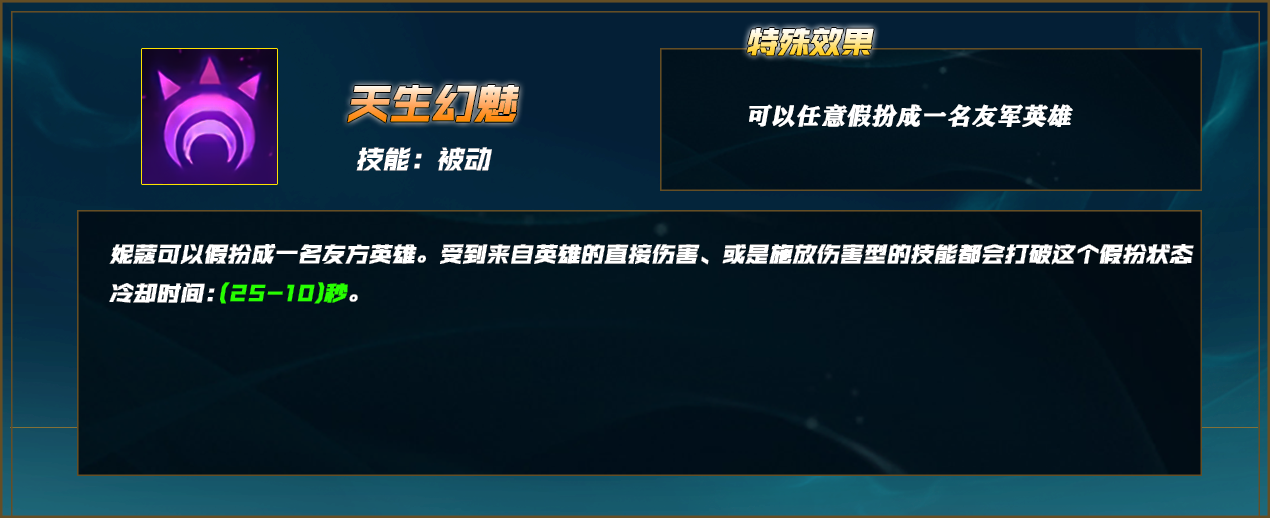 妮蔻可以假扮成一名友方英雄。承受来自敌方的伤害或是释放伤害技能都会打破这个假扮状态:被动技能游走的时候可以变成打野迷惑对手让对面不知道真正的打野在哪里,还有打团前一定要先变成队友,因为可以隐藏释放大招,变身的情况下对手是看不到我们放R技能的,只有落下来的那一刻才会看到一般很难反应。