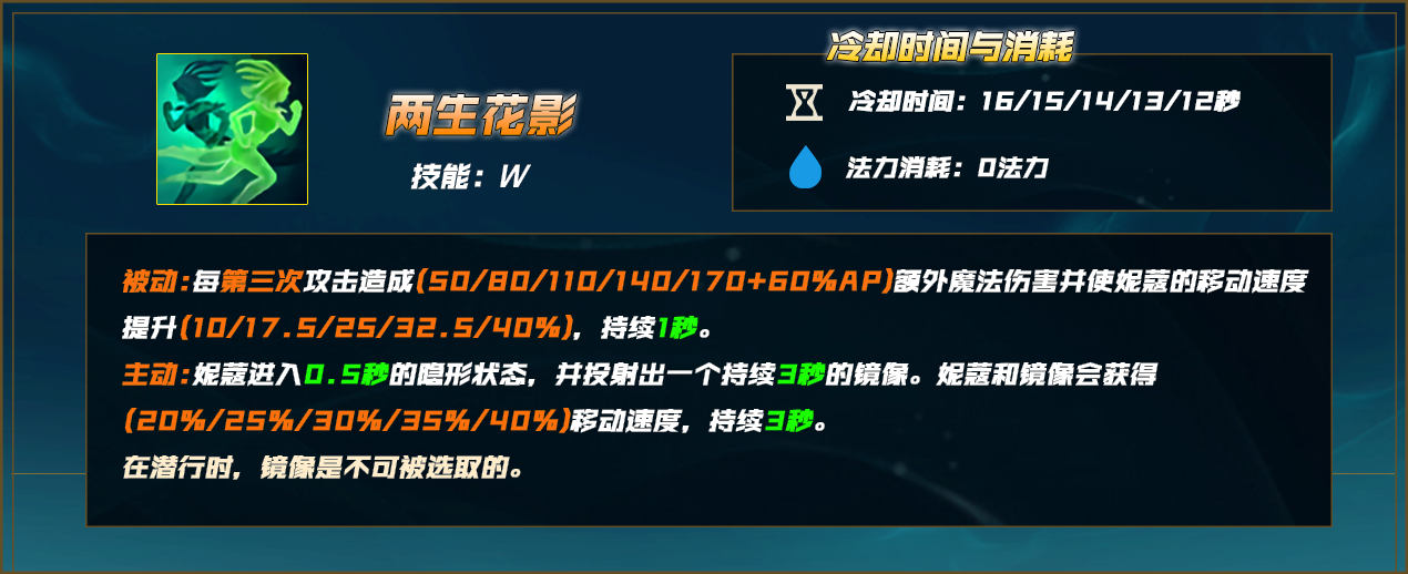 被动:妮蔻每第三次攻击造成额外的魔法伤害。主动:妮蔻能够朝一个方向投射出一个幻像。