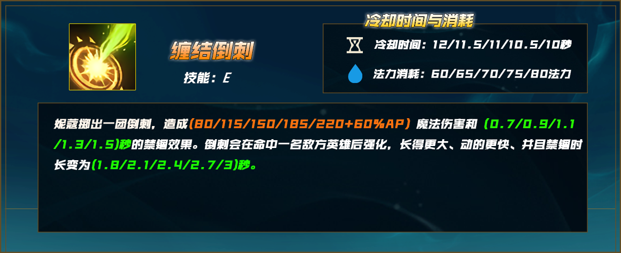 妮蔻投出一团倒刺,对它沿途的所有东西造成伤害和禁锢效果。如果倒刺击杀了一个敌人或者穿过了一名英雄,就会变得更大,更快并且禁锢时间更长。